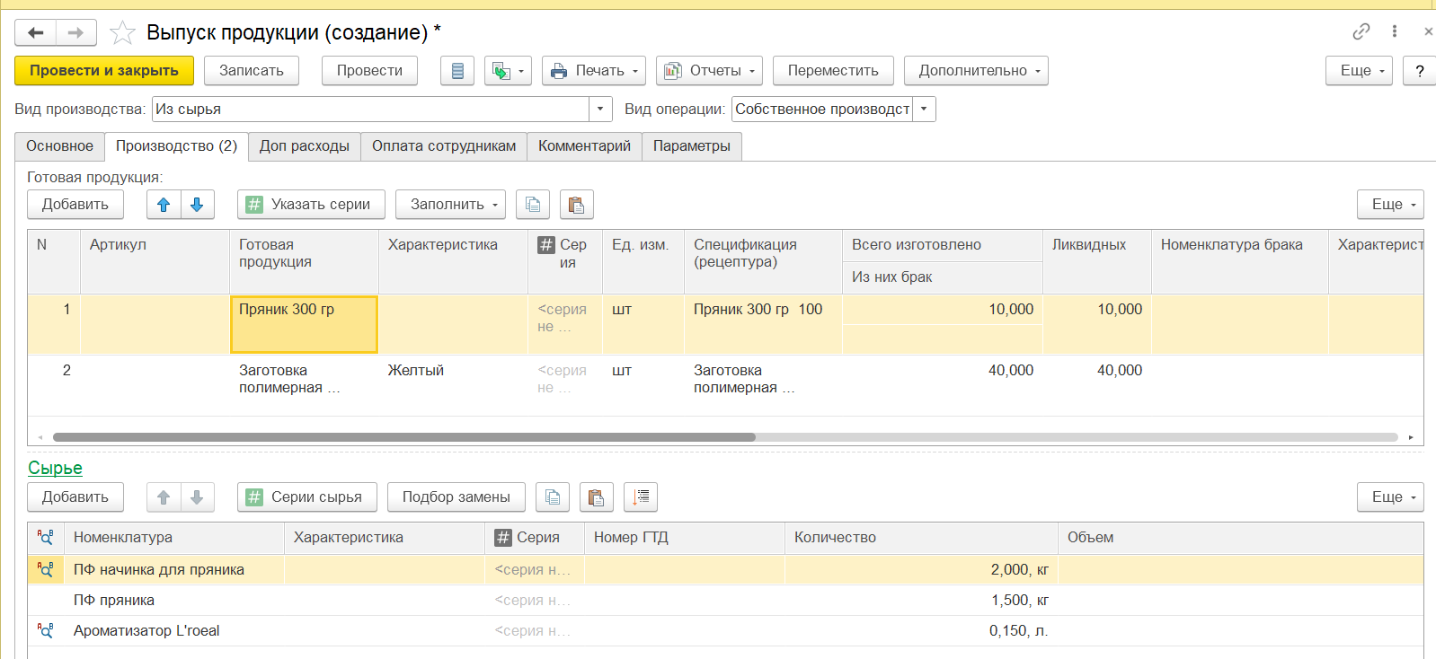 Количество продукции и, главное, соответствующий расход сырья подберем ровно столько, сколько имеется в графе «Доступно» из отчета «Остатки и доступность» как мы посмотрели ранее.