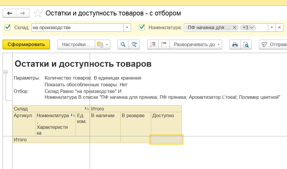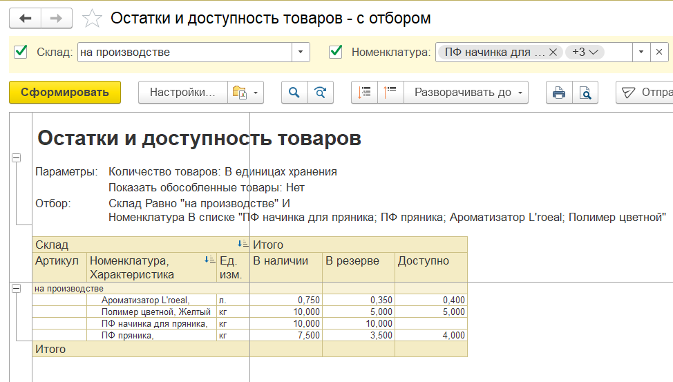 И по отчету мы видим, что общее количество «В наличии» осталось тем же, но уменьшился резерв и появилось свободное количество сырья – колонка «Доступно».