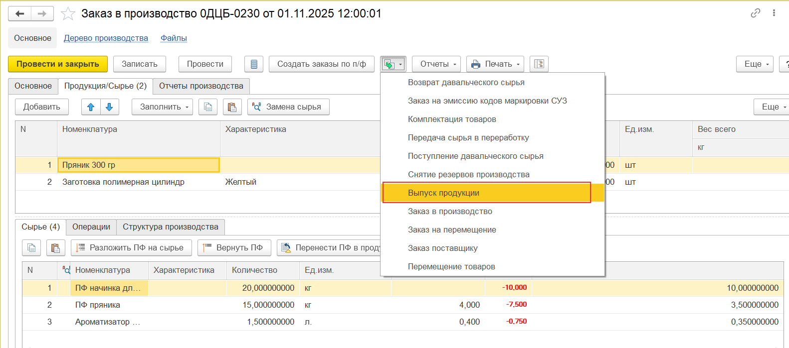 Теперь на основании документа «Заказ в производство» создадим документ «Выпуск продукции».