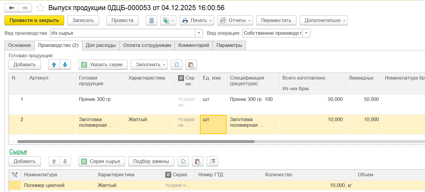 В 1С:УТ+Производство создаем документ «Выпуск продукции» такой же номенклатурой продукции как и в примере выше.