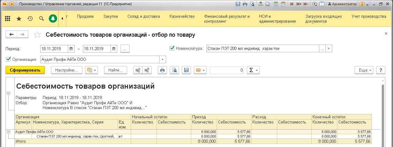 Но этот отчет в 1С показывает общую себестоимость выпущенной продукции без разделения на доп.расходы. Например, в одном выпуске учитывали доп.расходы, а в другом нет. Данный отчет покажет общую себестоимость.