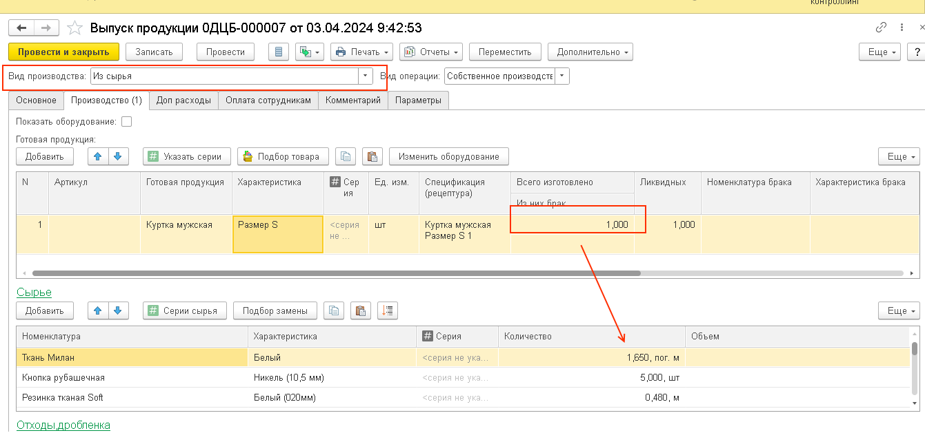 В верхней таблице мы так же указываем номенклатуру продукции, выбираем производственную спецификацию. И в таблице сырье все так же сырье из спецификации, но теперь это сырье будет не списываться, а приходоваться на склад в указанном количестве.