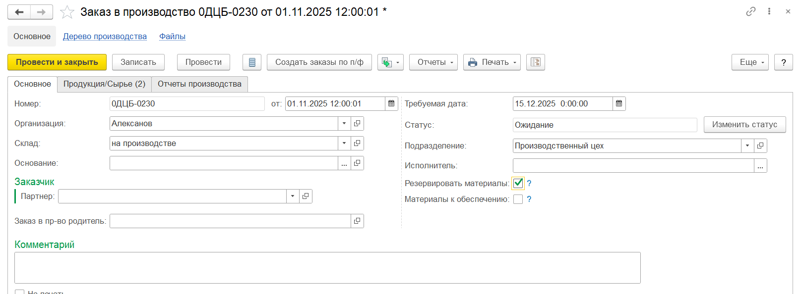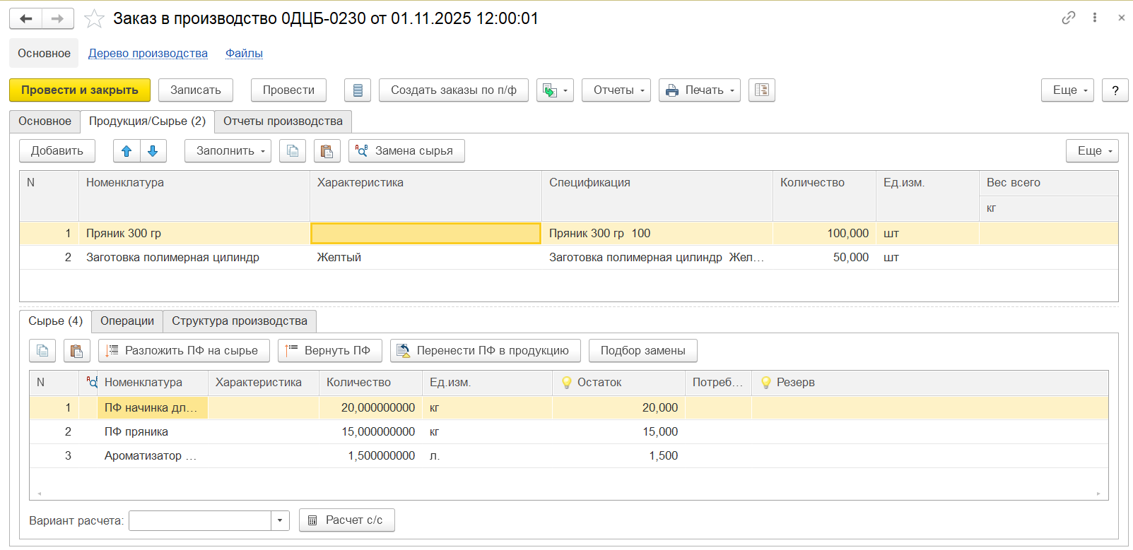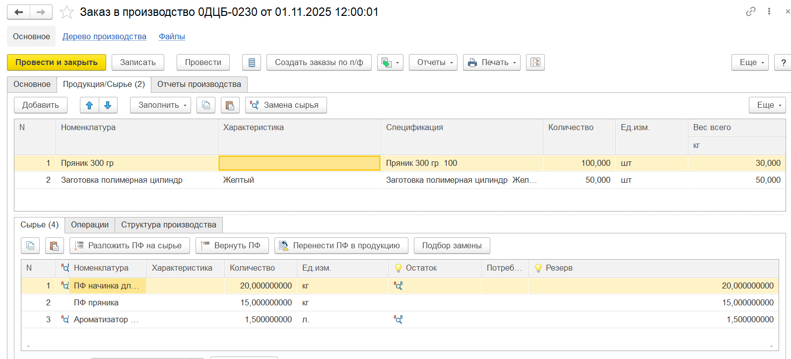 Таким образом, в момент создания документа «Заказ в производство» Вы можете зарезервировать имеющееся в наличие сырье (на дату документа, а не реальную текущую дату) точно для производства (создания документов «Выпуск продукции»), точно для данного заказа в производство.