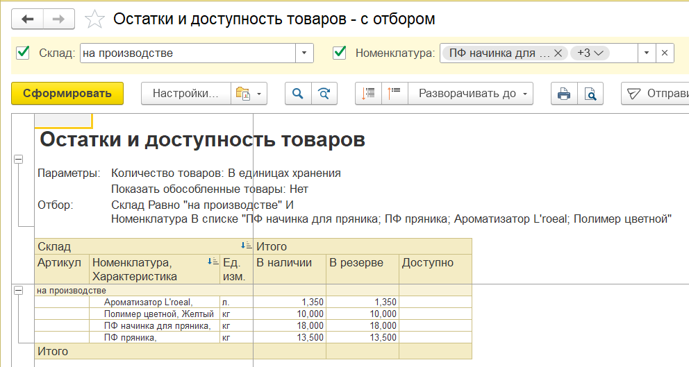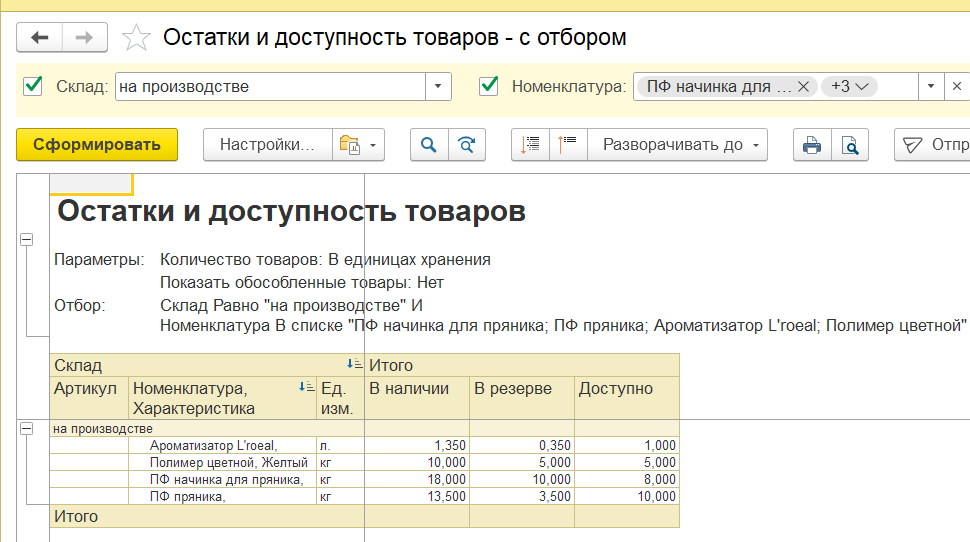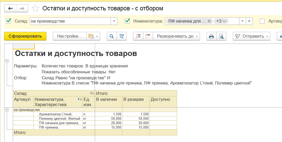 И по отчету мы видим, что общее количество «В наличии» осталось тем же, но уменьшился резерв и появилось свободное количество сырья – колонка «Доступно».
