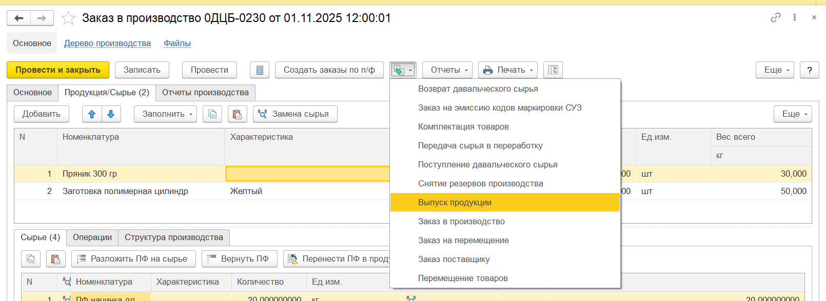 Теперь на основании документа «Заказ в производство» создадим документ «Выпуск продукции».
