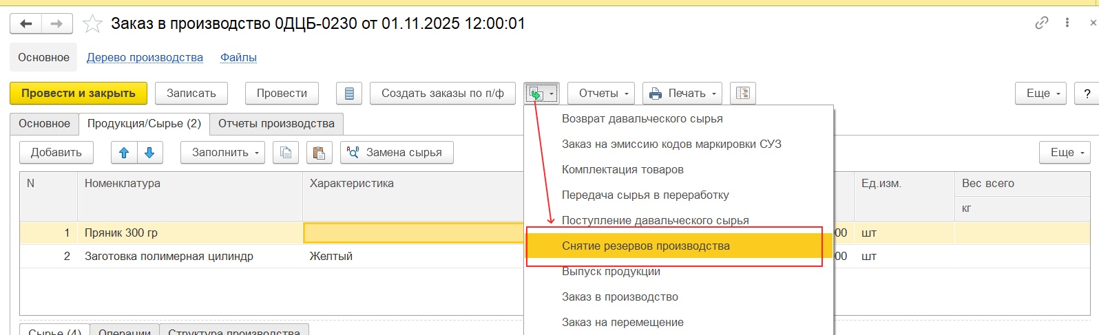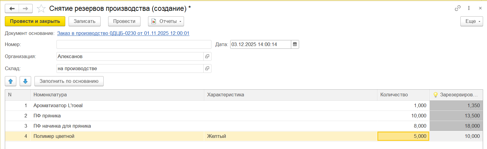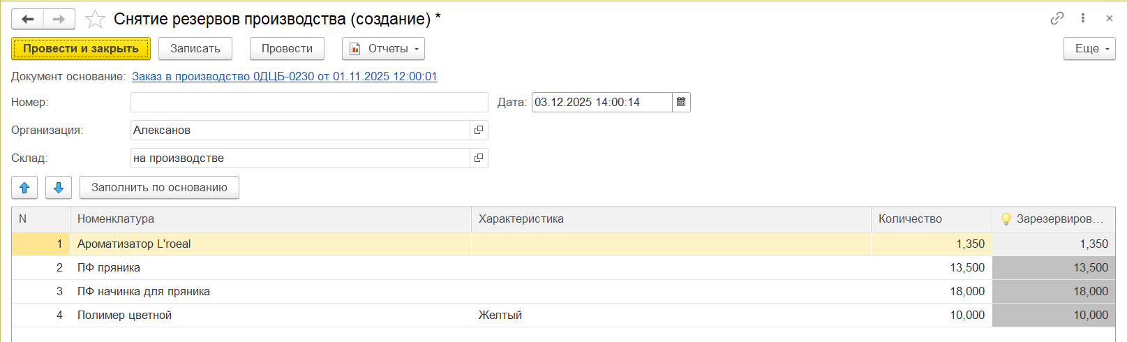 Кроме того, дата документа «Снятие резервов производства» не может быть меньше даты заказа в производство.