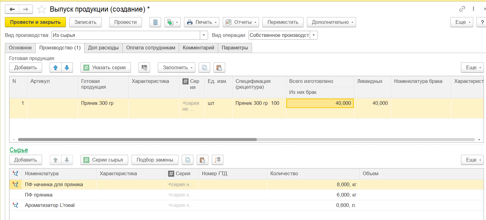 Количество продукции и, главное, соответствующий расход сырья подберем ровно столько, сколько имеется в графе «Доступно» из отчета «Остатки и доступность» как мы посмотрели ранее.