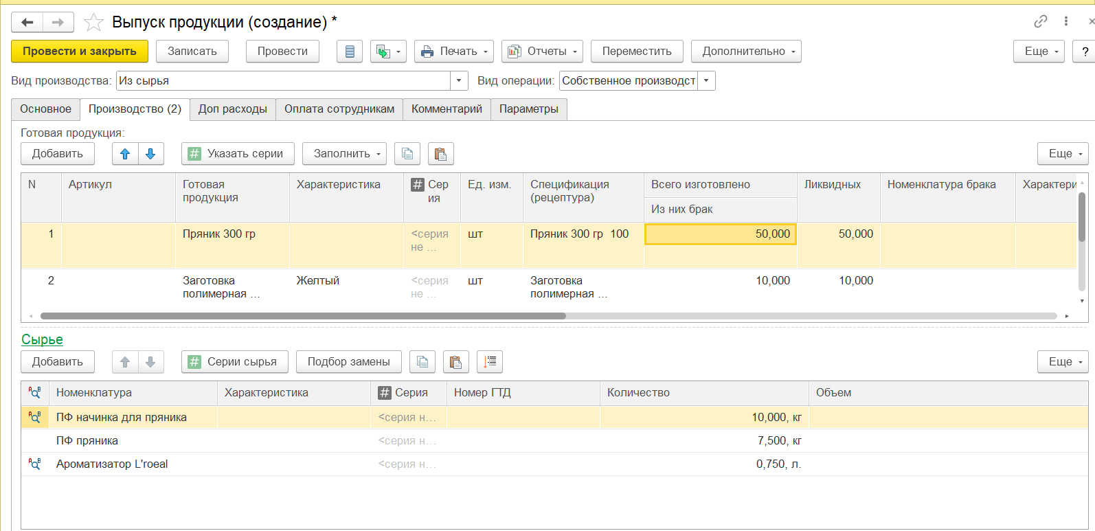 И в дальнейшем при создании документа «Выпуск продукции» на основании «Заказ в производство» используется зарезервированное сырье.