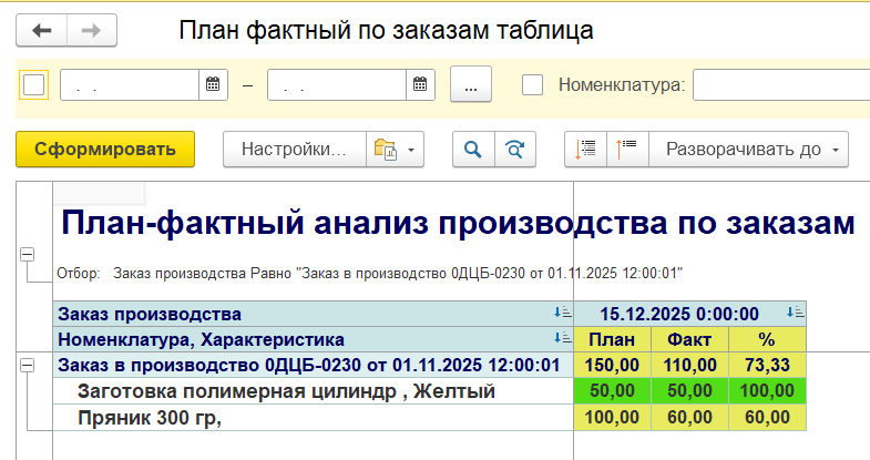 И статус производства можно увидеть в одном из отчетов план-фактный анализ по заказам.