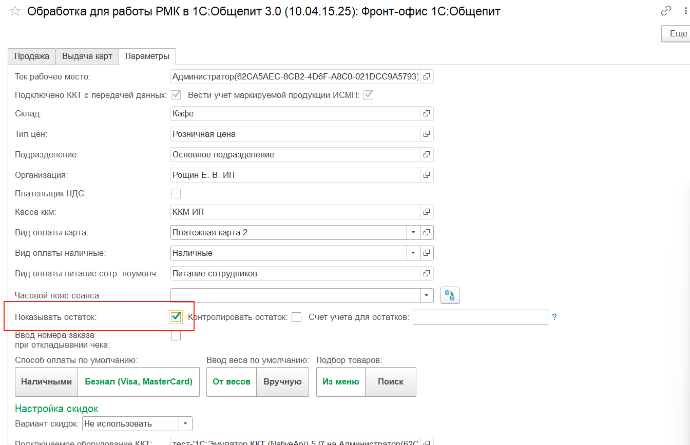 Для того, чтобы воспользоваться таким функционалом необходимо для начала включить опцию «Показывать остаток» на вкладке «Параметры» в РМК.
