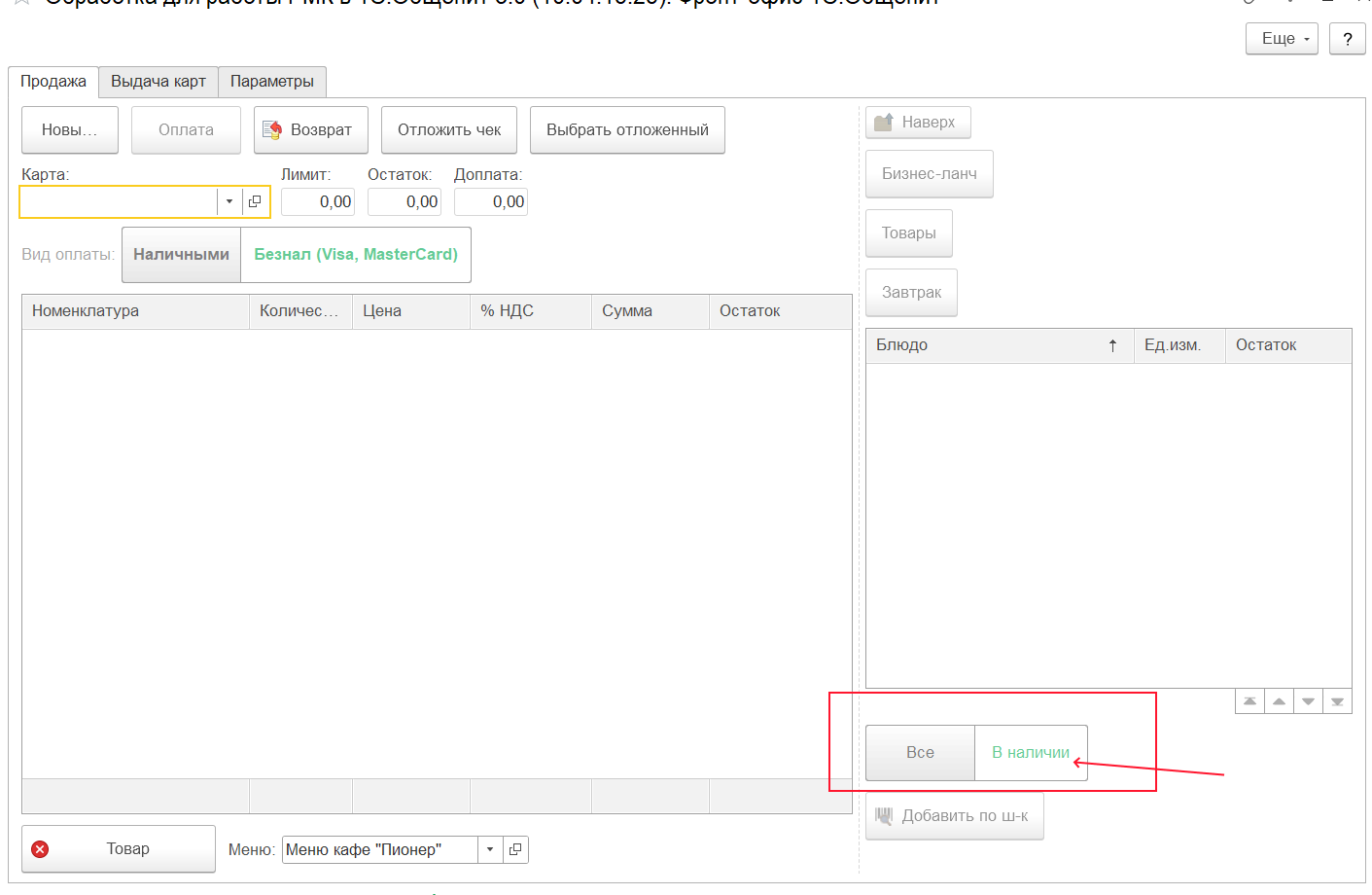 И начиная с версии РМК 10.04.16.* на вкладке «Продажа» внизу под списком товаров выбранной группы меню появляется элемент для выбора варианта отображения товаров – Все товары или В наличии.