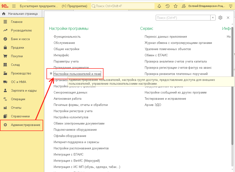 Для этого заходим в базу 1С:Бухгалтерия 1С:Фреш и переходим в раздел "Администрирование- Настройки пользователей и прав"